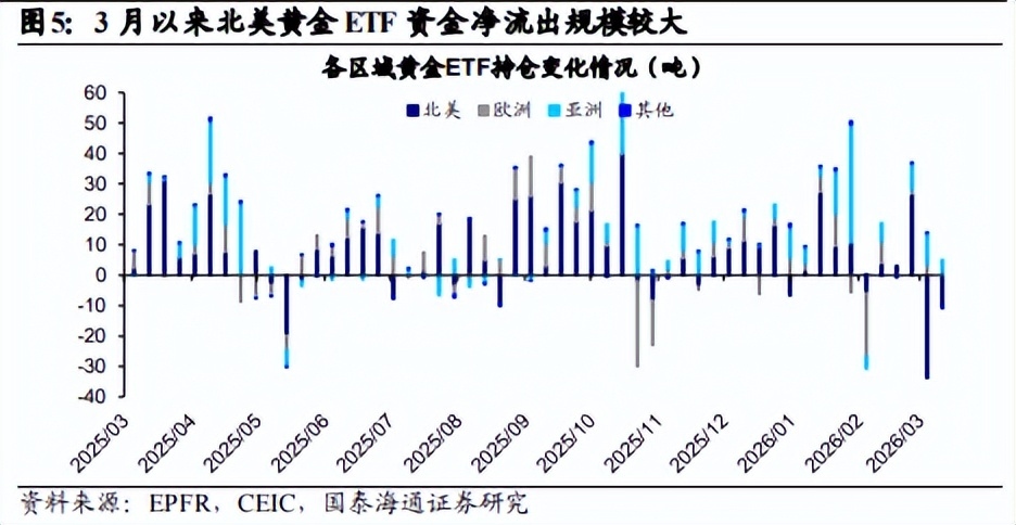 资金结构分化:美洲流出,亚洲坚挺:国泰海通证券对黄金资金流向的拆解显示,本轮黄金回调压力主要来自美洲资金的持续流出。美洲市场对黄金的投资热情与降息预期相关性较高,在货币政策预期扭转、加息担忧上升的情况下,黄金在美洲交易时段下跌压力明显,已跌去了2025年8月以来的全部涨幅。相比之下,亚洲交易时段黄金价格较为坚挺,亚洲黄金ETF仍呈资金流入趋势。世界黄金协会数据也印证了3月以来美洲黄金ETF持续流出,SPDR Gold Shares持有量较前一周减少14.57吨,而亚洲资金仍在净流入。