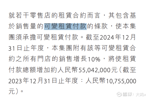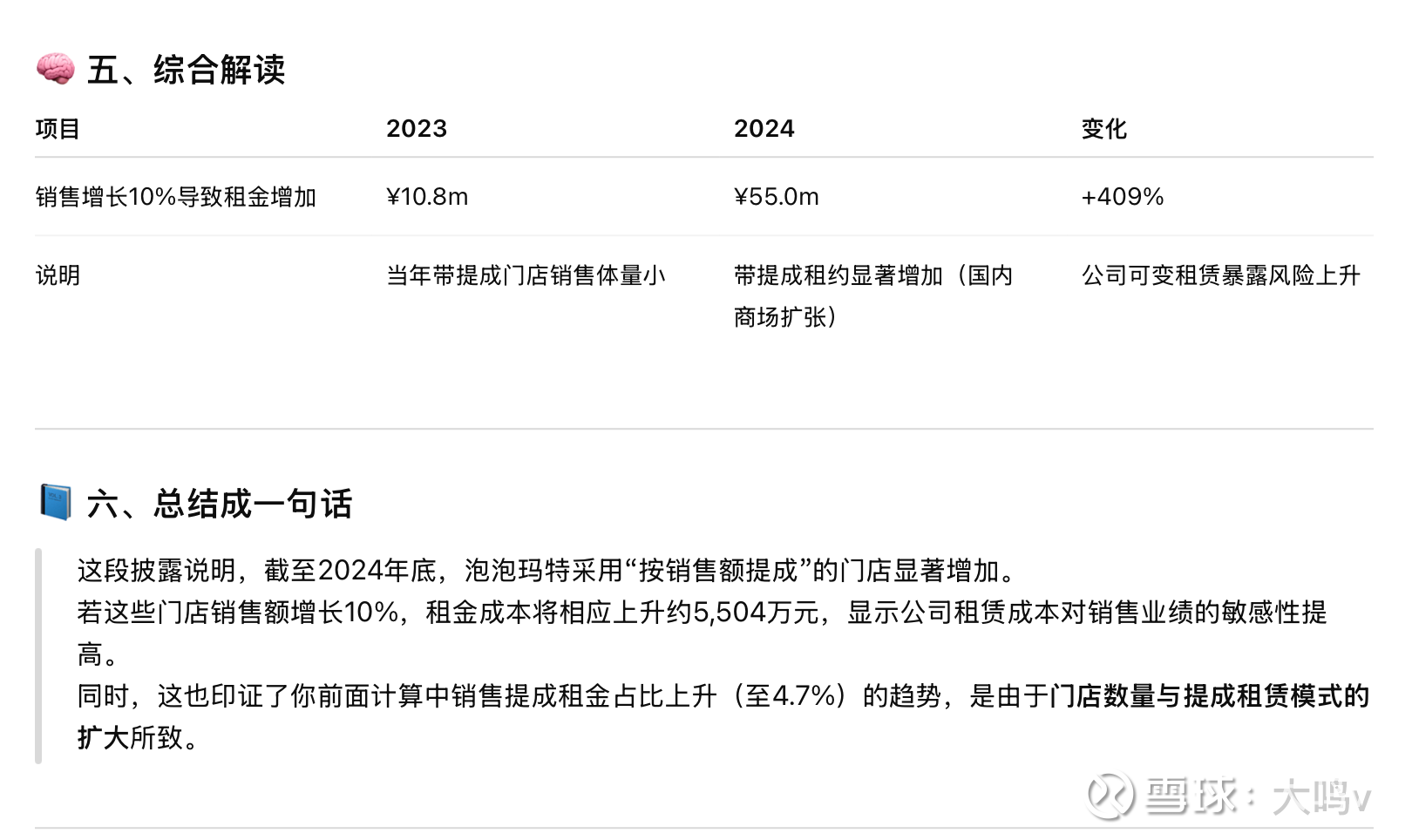 带提成租约显著增加(国内商场扩张),导致的销售涨10%,租金提成会从1000万提升到5000万。