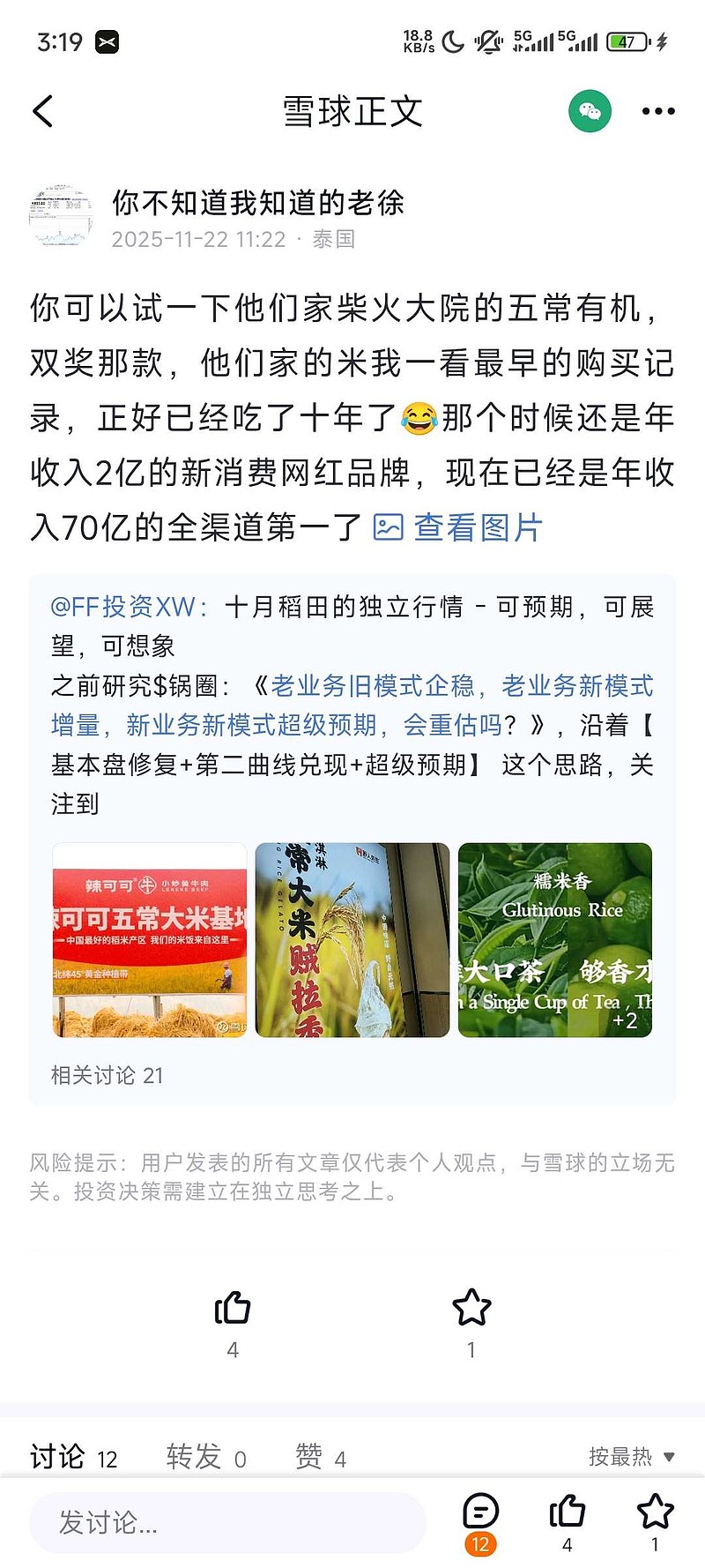 $十月稻田(09676)$老徐之前推的股票都还是不错的,推的$名创优品(09896)$ 、$比亚迪(SZ002594)$ 都是质地不错的股票,名创我也跟着赚到了钱。不过后来推了这个十月稻田,我感觉有点奇怪。因为这不是一个有壁垒的品牌,中国好吃的大米数不胜数,大米行业的头部效应非常不明显。况且在港股这个流动性的情况下,这种边缘股票崩起来是没边的。
