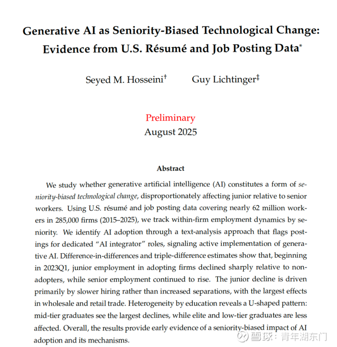 生成式AI并非主要针对技能层次,而是按照资历(seniority)分层冲击。换句话说,它不是让“蓝领”或“白领”消失,而是悄无声息地抽走了职场阶梯的第一层——初级岗位。