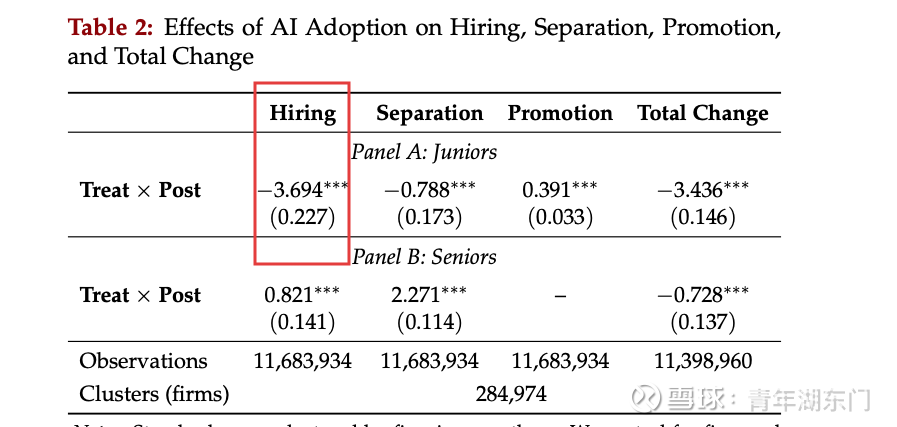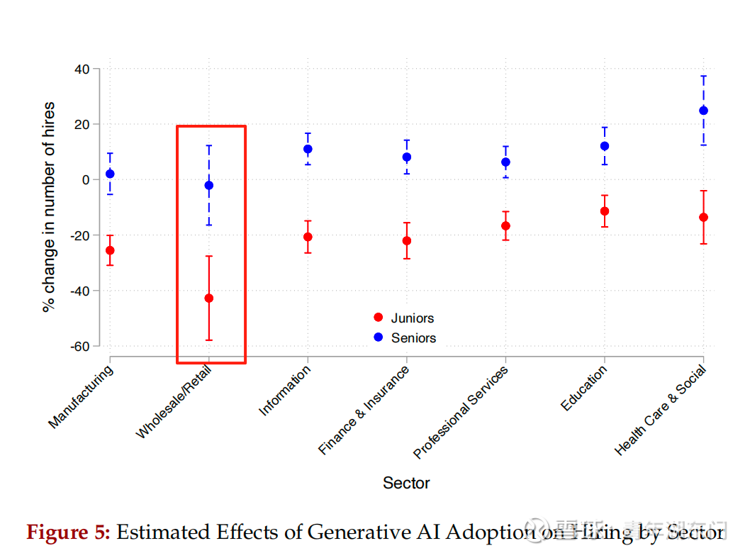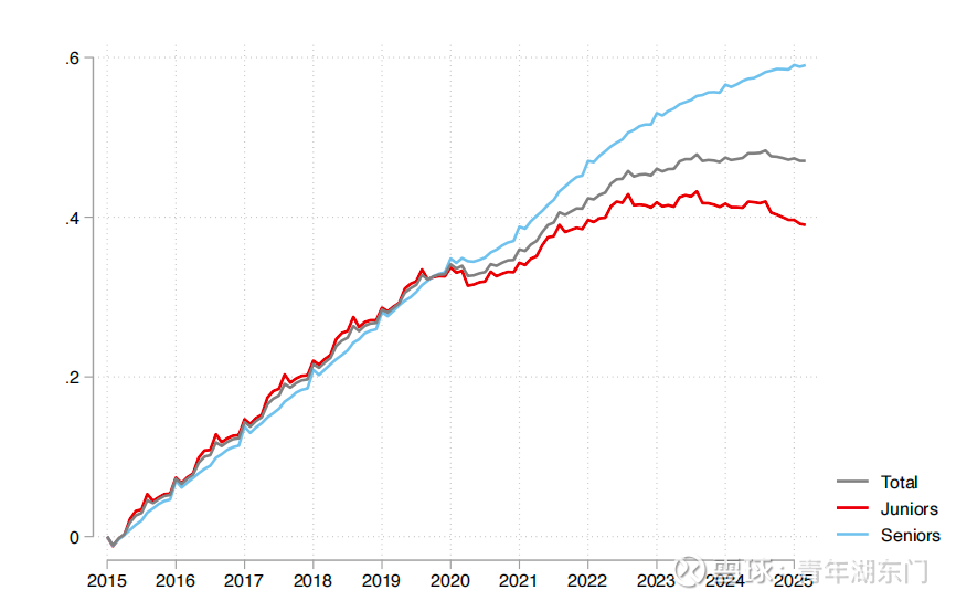 数据的结果是冷酷的。在采用AI的公司里,初级岗位的就业人数相较对照组断崖式下跌。六个季度后,差距拉大到 7.7%。与此同时,高级岗位不仅没有受到冲击,反而增长更快。