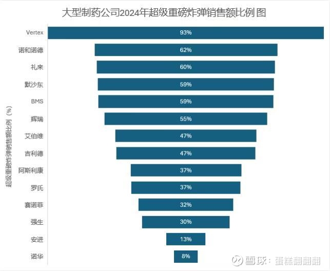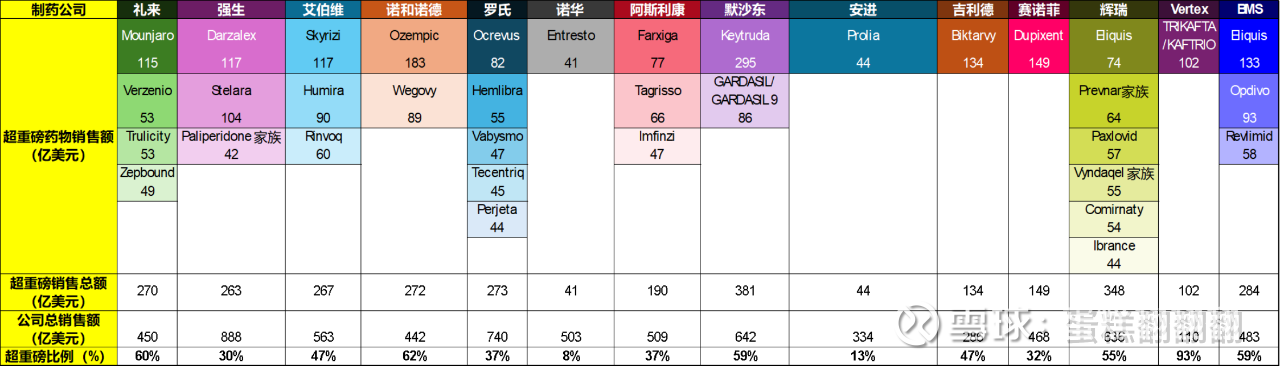 从统计来看,有6家公司的“超重磅炸弹”资产总额超过了年全部销售额的50%,其中有3家企业更是超过了60%。这种高度集中度说明,尽管这些公司规模庞大、管线丰富,但真正支撑其财务基本盘的仍是少数几个顶级产品。