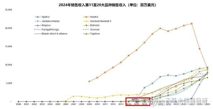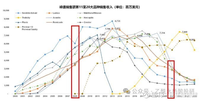 畅销药的平均达峰年限需要8年且药物成长曲线都差不多,平均销售额下探到最低值年份约21年。