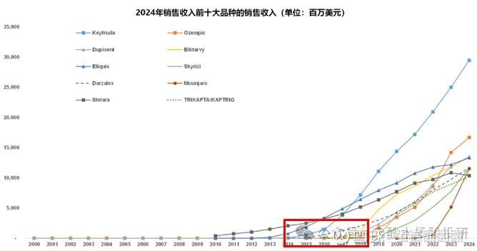 最新销售额最高的药物平均上市时间为6-10年。由此可见,神药每过十几年就会被新的神药替代,这就证明了巨头无法垄断以及神药的随机性。这给了创新药公司从小公司一步到位直达全球第一的可能性。