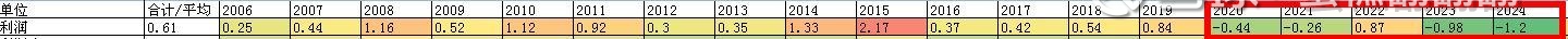 把资产价格的影响扣除,可以得到公司每年的利润如下,可以看到20多年的历史,只有18年和24年分别亏损0.4亿和0.8亿,历史平均的利润为0.5亿。