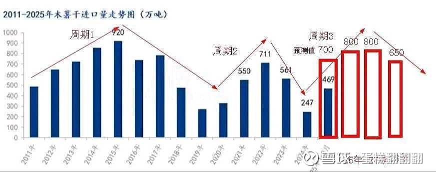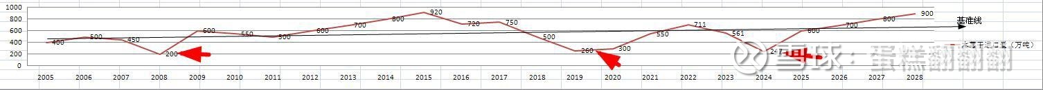 木薯干进口量预测:比如25年为什么预测600万吨,是因为可以查到前10个月进口了522万吨,属于公开数据,而26/27两年预测800万吨是根据木薯干进口量的周期性特征预测。