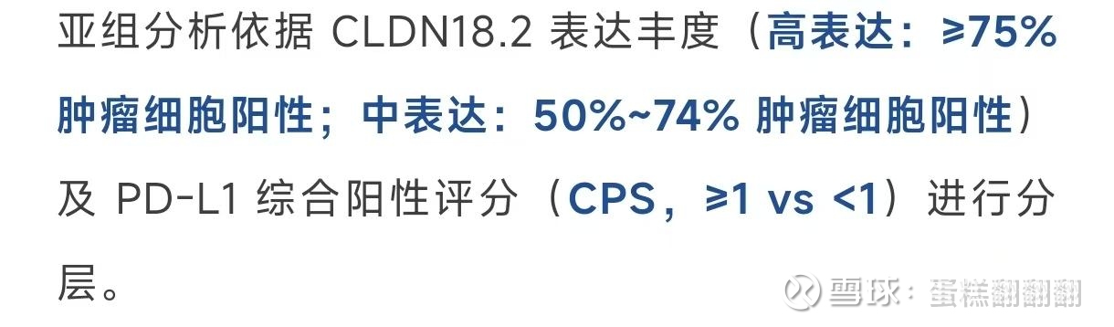 我们看安斯泰来最新的三联方案,加入了中表达:细胞表达50%~74%,比标准的40%~70%分别高了10%和5%。安斯泰来在联合化疗方案中已经排除了中低表达,原因就是对这部分人群获益不明显。三联方案加入中表达,又把标准提高,意图很明显,就是想通过三联方案的疗效把人群扩大一部分,可惜效果还是不明显。中表达人群MPFS仅6.7个月,这也证明了佐妥昔单抗只对高表达人群有效,因此三联三期临床无奈选择CLAUDIN18.2极高表达+CPS>1的高标准筛选方案。