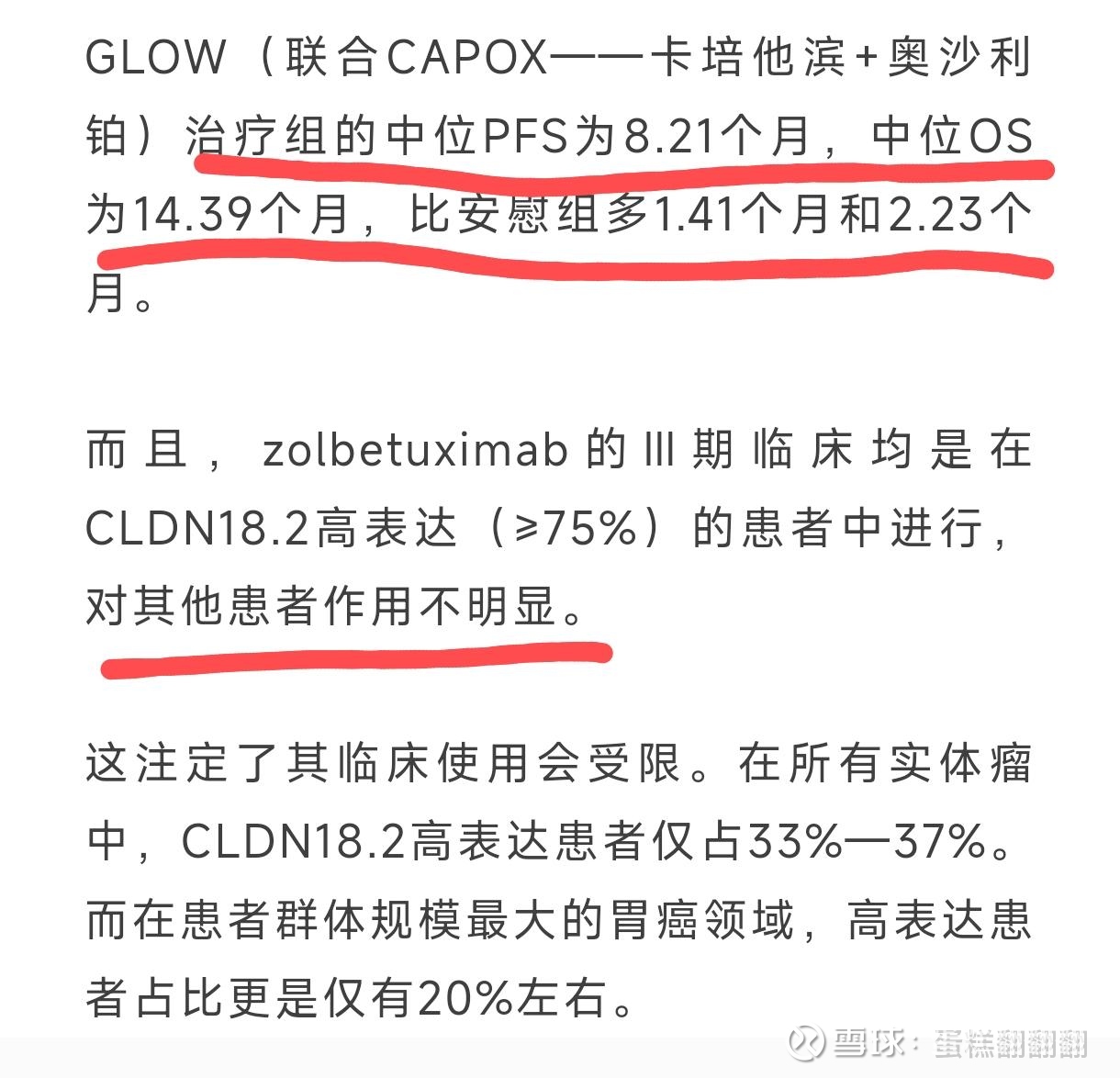 可惜,联合化疗方案虽然通过了,但是效果不惊艳。同样的联合化疗方案,安斯泰来的效果更明显一点。也就是说,胃癌领域,将来是CLAUDIN18.2药物主导,PD1辅助的格局。说个直白点的,一个胃癌肿瘤同时高表达CLAUDIN18.2跟PD1的时候,选择CLAUDIN18.2药物更好一点,也就是说CPS>5的17%的市场,大概要分流一半以上,只剩大概7%的市场,一线治疗大约4%。