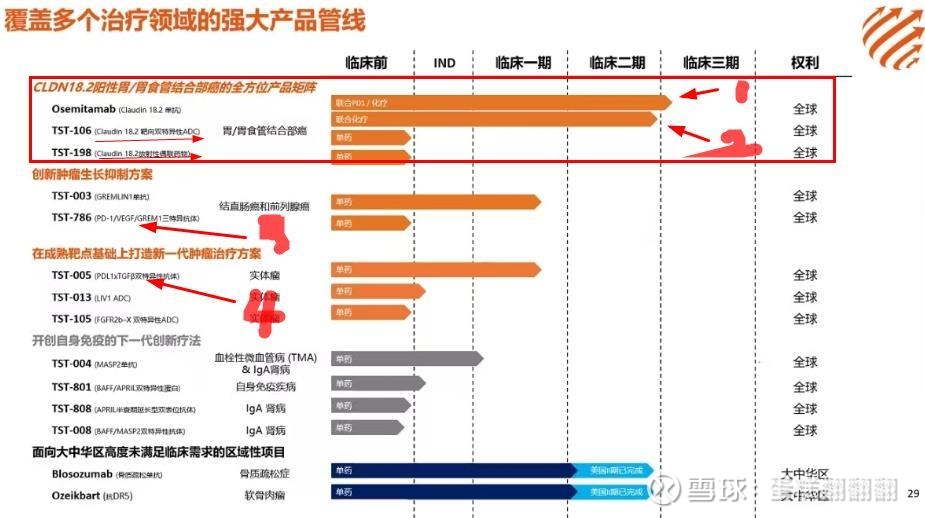 TST786、TST005则是超长期的免疫基石布局,将来预计与claudin18.2布局形成联用,主要是扩展至其他肿瘤领域。