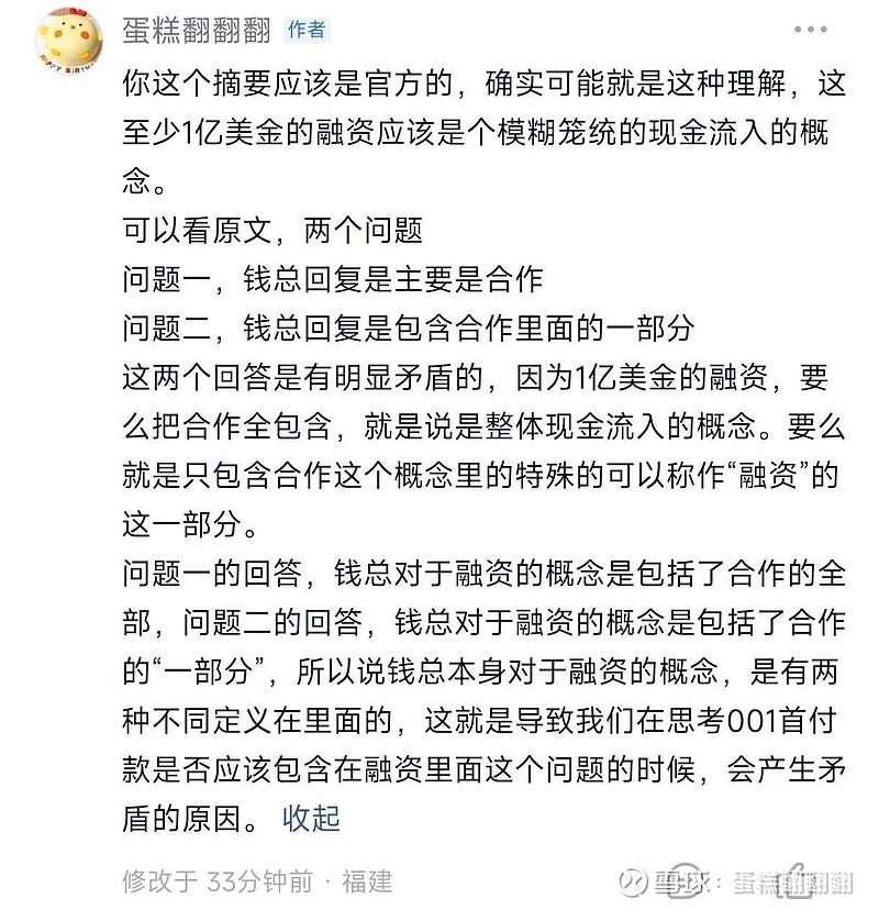 集中讨论融资计划至少1亿美金的理解及其与001首付款的关系