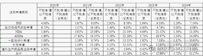 技术评审阶段要对生产工艺、药理毒理、临床数据进行评审。近五年需技术审评的化学药品注册申请不批准/建议不批准率整体呈波动趋势,分别为3.54%、6.51%、2.89%、2.42%和1.72%,考虑到申请人主动撤回申请在某种意义上也是不批准的一种形式,因此同步将不批准/建议不批准率(含其他)也进行了统计,分别为23.36%、13.29%、12.66%和11.27%。下表是近五年的数据: