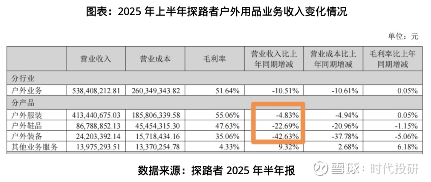 然而,好景不长。2025年三季报显示,探路者前三季度实现营业收入9.53亿元,同比下降13.98%;扣非净利润为2694万元,同比暴跌70.46%。值得一提的是,营收占比约80%的户外用品业务,受市场环境变化及新品迭代不及预期影响,销售持续承压。2025年半年报显示,上半年,探路者的户外服装营业收入同比下滑4.83%,户外鞋品营业收入同比下滑22.69%,户外装备营业收入同比下滑42.63%,核心品类增长乏力。