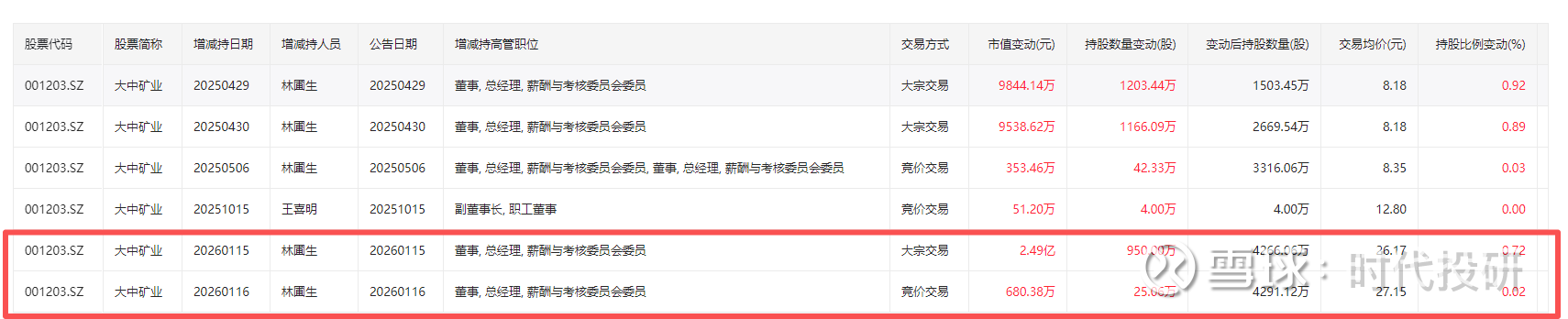据交易平台相关信息,大中矿业董事、总经理林圃生已于近三个交易日(2026年1月15日至19日),通过大宗交易和集中竞价的方式连续三次增持公司股票,共计增持公司股份1533.08万股。