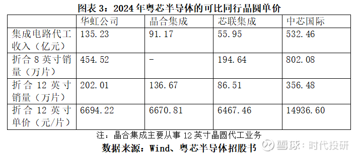 对比来看,招股书中列举的可比同行华虹公司(688347.SH)、晶合集成、芯联集成、中芯国际(688981.SH)2024年的晶圆单价分别为6694.22元/片、6670.81元/片、6467.46元/片、14936.60元/片(8英寸晶圆数量是将12英寸晶圆数量乘2.25),远超粤芯半导体同期单价。