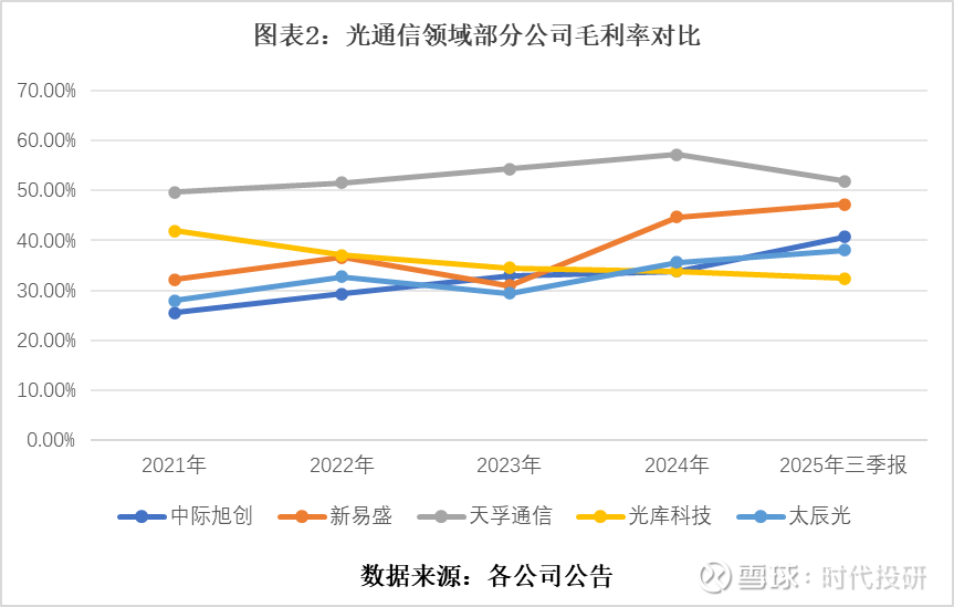 首先,由于身处上游环节,天孚通信竞争格局相对清晰。该公司毛利率常年保持在50%以上,高于中际旭创与新易盛。尽管2025年因有源器件销售占比提升和芯片成本上涨,导致其毛利率同比下降,但仍明显高于光库科技(300620.SZ)、太辰光(300570.SZ)等国内同业。