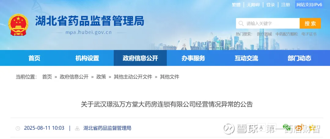 日前,湖北省药监局发布一则“企业经营异常”公告,湖北省药监局执法人员到武汉璟泓万方堂大药房连锁有限公司(经营地址为武汉东湖新技术开发区豹澥街生物园东路18号总部及生产研发基地(全部自用)仓储物流中心栋/单元4层/号(自贸区武汉片区))开展日常检查,发现该公司未正常开展经营活动,且无法联系到该公司法定代表人等相关负责人。请该公司自公告之日(8月11日)起30日内与湖北省药监局武汉分局联系。