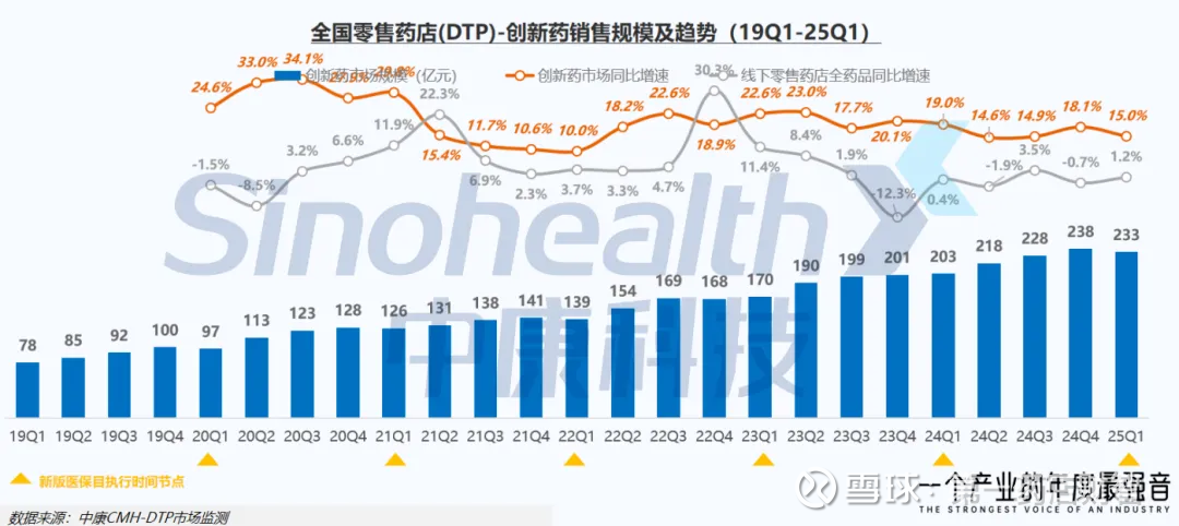 在2025西普会DTP药房新发展峰会上,中康科技商用数据事业部CSM总监郭赞华发布的《长坡厚雪:创新药零售市场趋势洞察》报告指出,2024年零售药店(DTP)创新药销售规模达887亿元,同比增长16.6%;2025年一季度规模增至233亿元,同比增长15.0%。创新药在DTP渠道持续保持双位数高增长,增速超过等级医院渠道的三倍,显示其渠道价值实现质的飞跃。