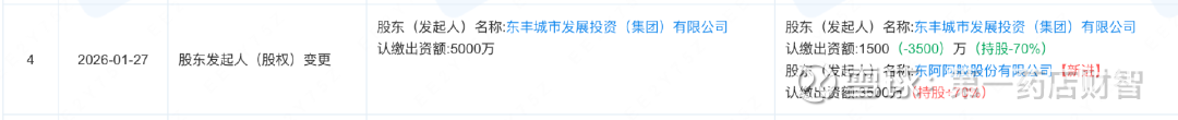 企查查信息显示,1月27日,东阿阿胶股份有限公司(以下简称“东阿阿胶”)认缴出资3500万,拿下东丰马记药业有限公司(以下简称“东丰马记药业”)70%股权,成为其控股股东,原股东东丰城市发展投资(集团)有限公司持股比例降至30%。