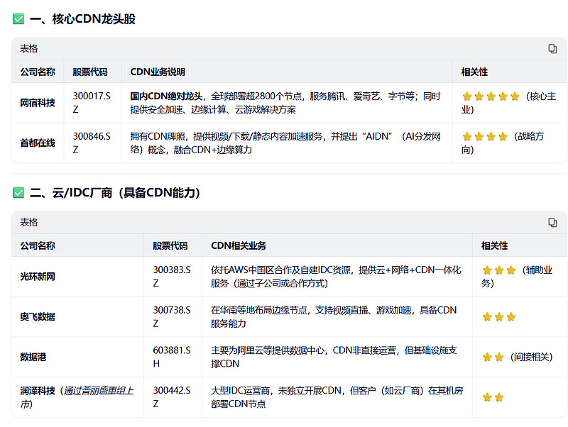 公司名称股票代码CDN相关业务相关性光环新网300383.SZ依托AWS中国区合作及自建IDC资源,提供云+网络+CDN一体化服务(通过子公司或合作方式)⭐⭐⭐(辅助业务)奥飞数据300738.SZ在华南等地布局边缘节点,支持视频直播、游戏加速,具备CDN服务能力⭐⭐⭐数据港603881.SH主要为阿里云等提供数据中心,CDN非直接运营,但基础设施支撑CDN⭐⭐(间接相关)润泽科技(通过普丽盛重组上市)