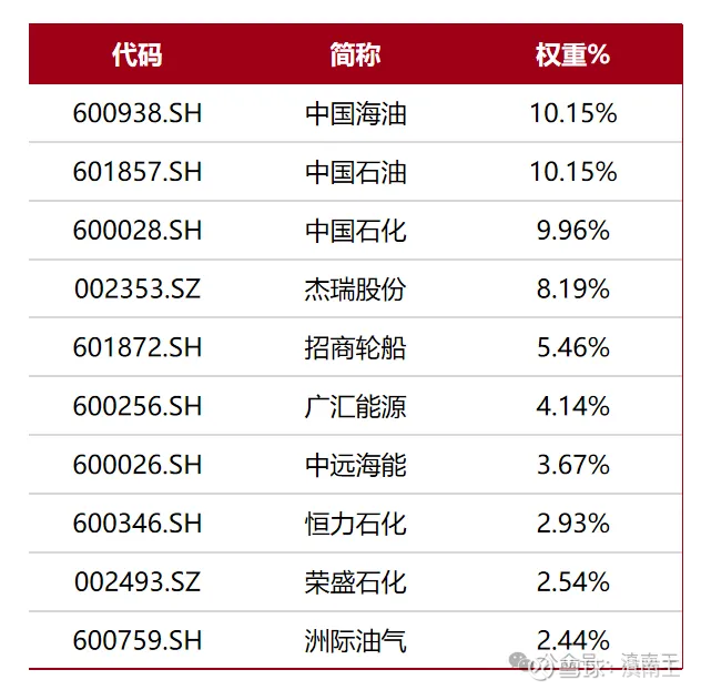 从指数的核心成分看,都是一些非常核心的企业,比如负责海上石油开采的中国海油,负责陆地石油开采的中国石油,还有全球最大的石油炼化企业中国石化,包括石油运输的招商轮船和中远海能!从产业的结构看,主营业务涉及石油与天然气的开采商、设备制造、运输、销售、炼制加工,以及初级石油化工产品生产领域的企业作为样本,还是很全面的!