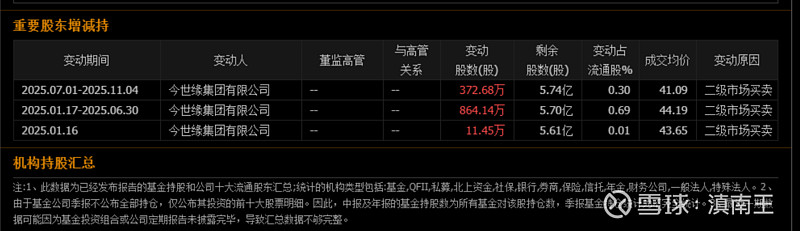 细看了一下,白酒在2025年增持股份的企业,今世缘还是值得留意的,自2024年12月31日至2025年11月4日期间,今世缘集团通过集中竞价方式累计增持公司A股股份1248.27万股,占公司当前总股本的1.0012%,累计增持金额为人民币5.4亿元,本次增持计划实施完毕。我计算了一下,5.4亿增持了1248.27万股,平均增持价格是43.25元!大家没看错,现在才32元,还是值得重视的!$今世缘(SH603369)$ $贵州茅台(SH600519)$ $五粮液(SZ000858)$