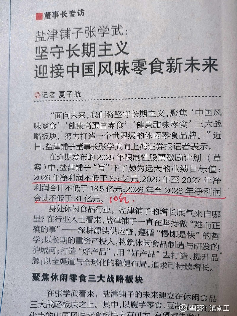 看了对盐津铺子董事长的拜访,还是吃惊的,按照这规划,未来三年平均净利润10个亿,是不是画大饼呢?洽洽和涪陵榨菜这么多年,也没突破10亿,感觉10亿净利润是好多企业的一个门槛!$盐津铺子(SZ002847)$ $洽洽食品(SZ002557)$ $涪陵榨菜(SZ002507)$