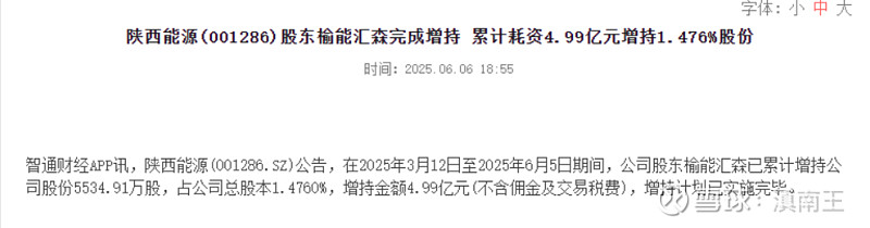 发现一个市场的规律,一定要重视大股东增持的企业!给大家举个例子,陕西能源在2025年3月11日晚间发布公告称,公司大股东陕西榆林能源集团汇森投资管理有限公司拟增持股份的金额不低于人民币2.5亿元,不超过人民币5亿元!然后到2025年6月6日,陕西能源发布公告,在2025年3月12日至2025年6月5日期间,公司股东榆能汇森已累计增持公司股份5534.91万股,占公司总股本1.4760%,增持金额4.99亿元(不含佣金及交易税费),增持计划已实施完毕。可以算出来,平均每股增持均价是9.01元,按照现在11元的价格算,半年的时间,已经出现浮盈22%,大股东才是真正的投资高手!$陕西煤业(SH601225)$ $陕西能源(SZ001286)$ $中国神华(SH601088)$