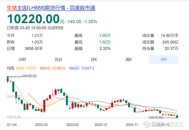看到这消息,心里还真不是滋味,2026年3月19日,全国生猪均价跌至9.95元/公斤,失守10元关口,这个价格是最近20年最低的价格,目前养殖端已全面亏损,有上市公司人士表示,“现在这个阶段大家都只能硬抗,几乎没有公司能够盈利。”业内人士认为,短期内猪价仍将继续低位磨底,但下半年或存在行情好转可能性,母猪产能去化在二、三季度或真正迎来加速。面对油价的上涨,猪肉的下跌,真是两个极端,会看了一下过去四年价格,一路往下,石油和猪肉,两个就是相反的商品,背后的原因又是什么呢?$牧原股份(SZ002714)$ $中国海油(SH600938)$ $双汇发展(SZ000895)$