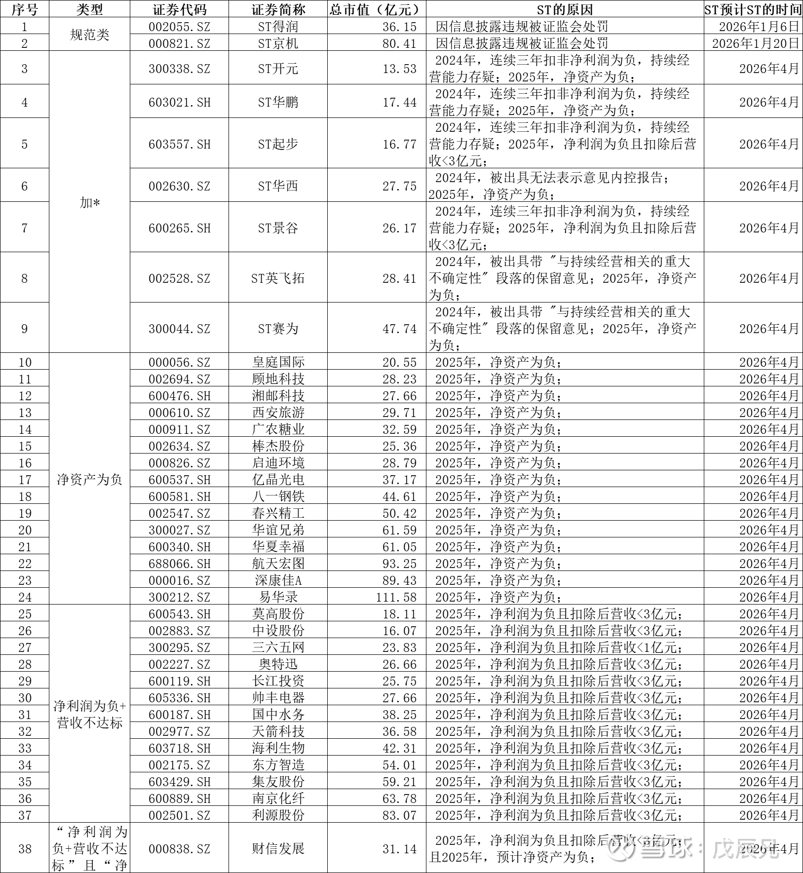 截止2026年1月31日,ST和预计ST的上市公司共38家。其中,2家规范类新ST,7家加*,29家会在2026年4月公布审计报告之后被*ST。