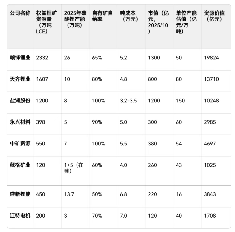 现有碳酸锂产能公司产能与估值对比:
