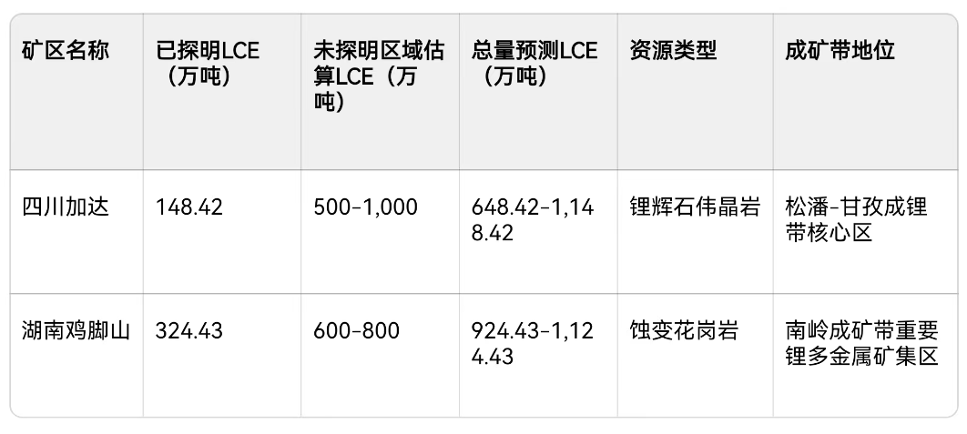 2025年10月28日公布- 湖南鸡脚山锂矿 :位于湖南省临武县,其全资孙公司郴州市城泰矿业投资有限责任公司于2025年10月28日正式取得该矿的《采矿许可证》,有效期30年。经自然资源部评审备案的锂矿资源量达4.89亿吨,折合碳酸锂当量约324.43万吨,矿山采用“先露天、后地下”的开采方式,露天开采规模为2000万吨/年,地下开采规模为800万吨/年。这不是整个矿区的所有储量,只是探明储量(探明储量为主要储量区域),占整个矿区的23%左右,概况环保等级很高,碳酸锂成本大概4万元/吨,具有较大成本优势。
