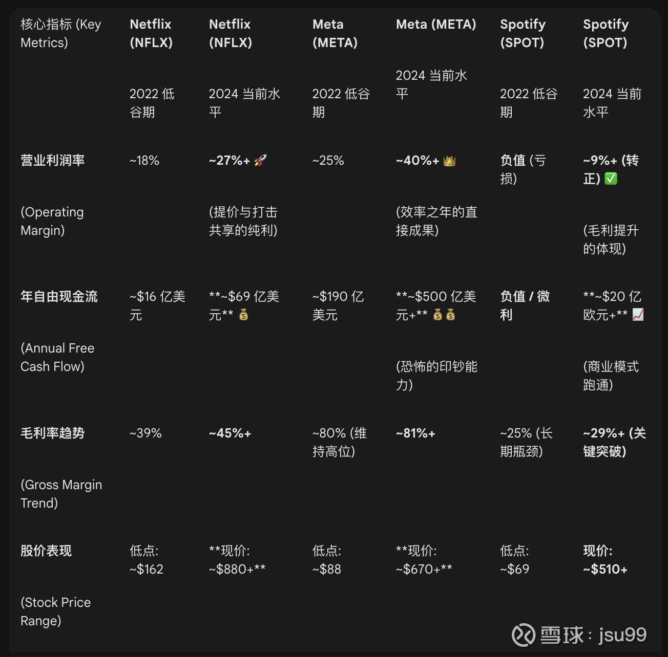结语: Netflix, Meta, Spotify 的故事告诉我们,在科技行业,没有永远的赢家,但拥有强大护城河和极其灵活纠错机制的巨头,即使在最深的谷底,也蕴藏着惊人的反弹能量。对于投资者而言,在众人恐慌时,深入分析企业核心商业模式是否真正受损,关注现金流和经营杠杆的拐点,或许是通往超额回报的唯一路径。
