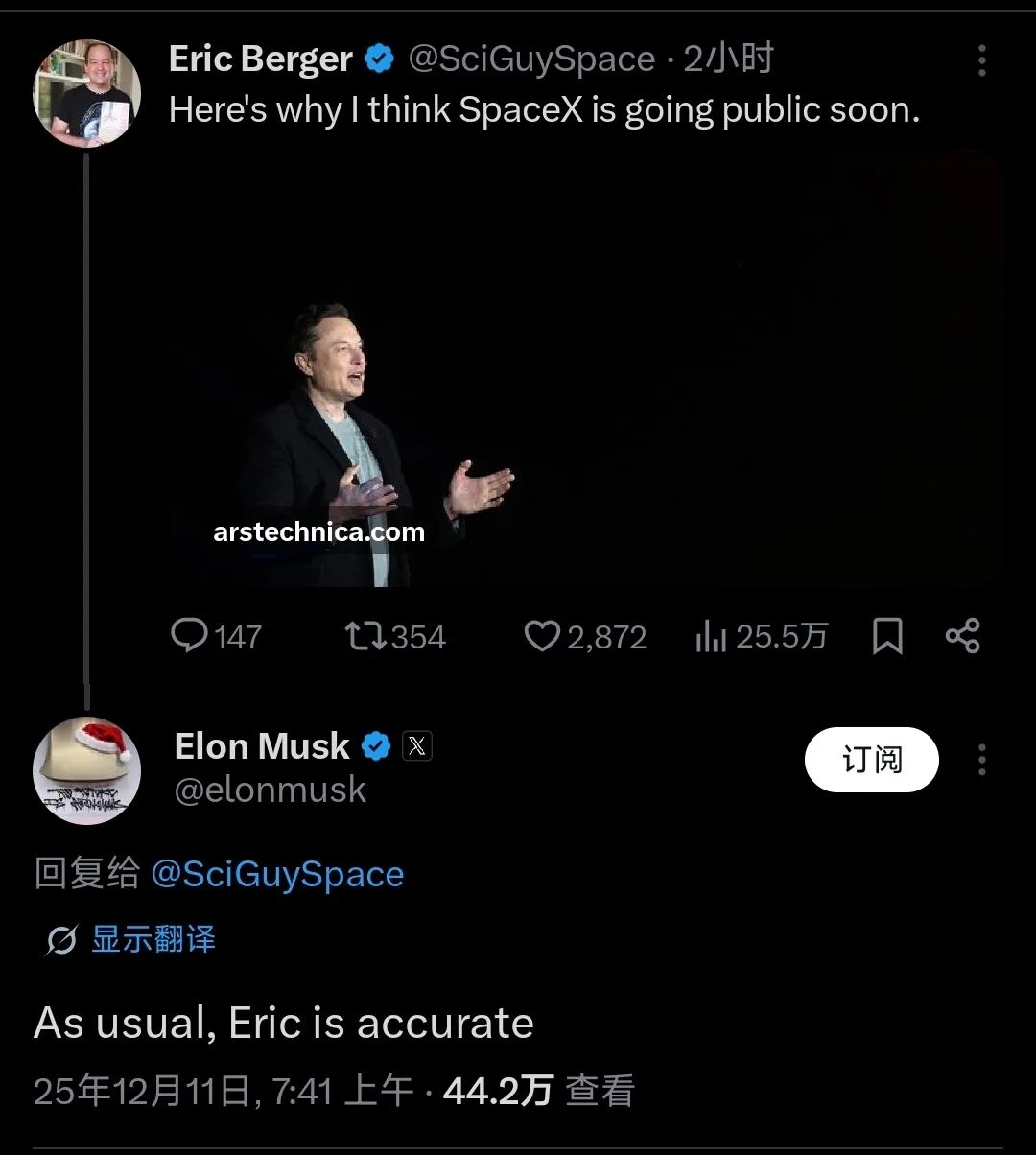 科技媒体Ars Technica的高级太空编辑Eric Berger在X上转发了一篇文章并评论:“以下是我认为SpaceX即将上市的原因。”马斯克火速点评,确认了SpaceX上市的传闻:“一如既往,Eric的描述是准确的。”
