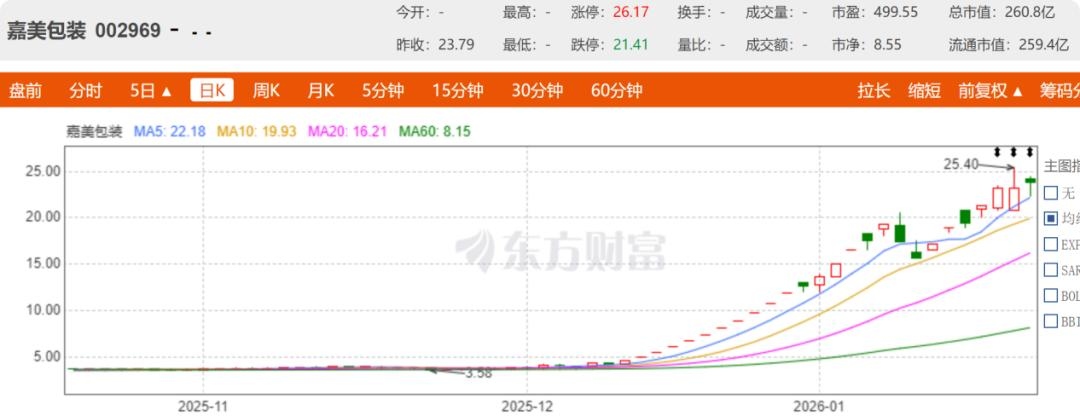史保刚认为:“借壳上市可避免IPO排队等待,快速获得A股融资平台。尽管追觅科技业绩表现出色,但作为非上市公司融资渠道有限。通过借壳嘉美包装,可立即获得融资、并购、股权激励等资本工具,支持其多业务扩张。”自2025年12月18日嘉美包装发布公告后,其股价已经由5.52元一路飙升至2月3日收盘的23.79元,涨幅高达331%。嘉美包装股票复牌即封涨停,单日涨幅达10.09%。随后连续收获多个涨停板,市值从43亿元增至258亿元,一个多月市值暴增210多亿元,市场反应热烈。