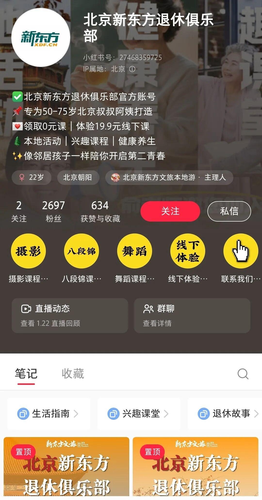 1月中旬,拥有较强品牌号召力的新东方从北京地区试点,开始做退休俱乐部,面向50-75岁人群。宣称每月2次小聚会,免费3门兴趣课。活动玩伴为80后90后。小红书账号内容显示布局时间不长,但是已经建到了第三个粉丝群,其中2个都是满500人的社群。