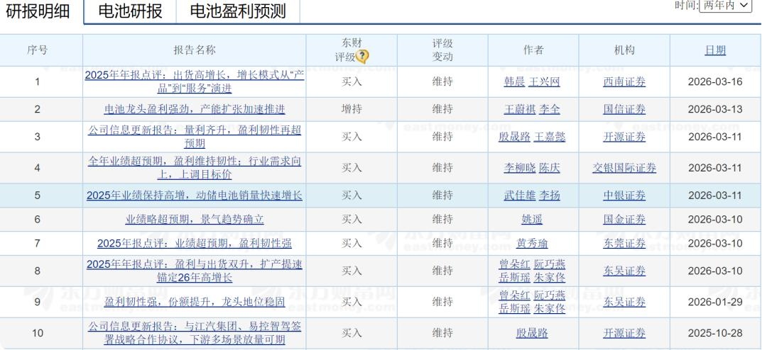 进入2026年有9家机构对宁德时代进行评级,这9家机构均对宁德时代进行了“买入”和“增持”的评级。在财报发布后有西南证券和国信证券对宁德时代进行“买入”和“增持”的评级。