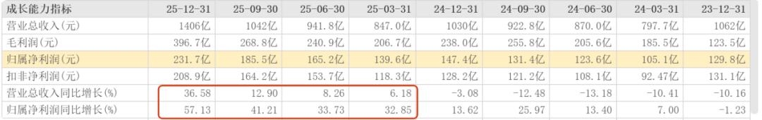 宁德时代2025年全年表现出色,最出色的当属2025年第四季度。这一季度营收1406亿元,同比增长36.58%,归母净利润231.7亿元,同比增长57.13%。其中营收增幅为2023年第二季度以来新高,净利润增幅也是2023年第二季度以来新高。2024年第四季度的营收和净利润增幅分别为-3.08%和13.62%。