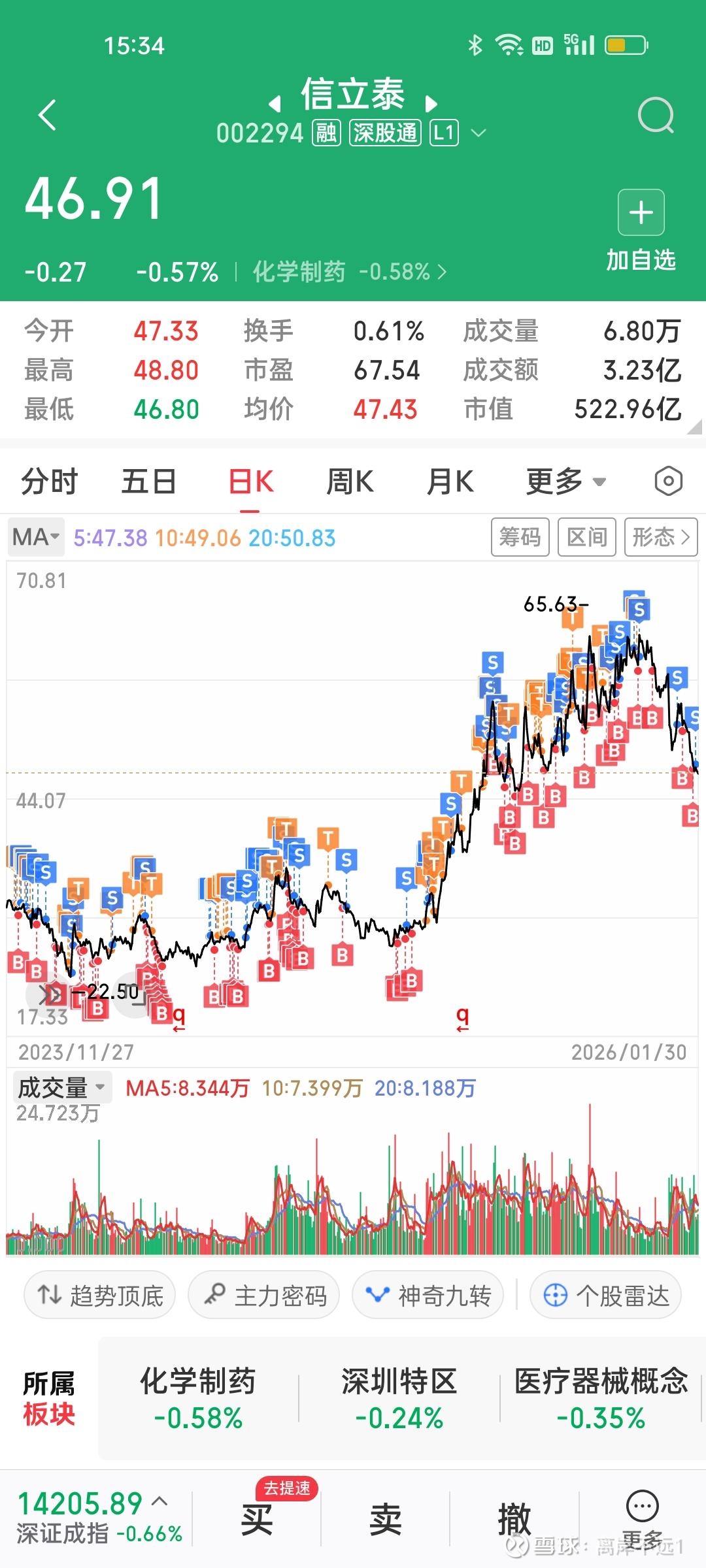 回到要不要做T上,我认为还是得根据自己的诉求来看是否应该做T。例如自己资金充裕且买点比较低,只要一直看好这只股票的前景,那就可以不用做T,一路持有就行了。这样也能赚到大钱,据我所知在信立泰上好多人都大仓位赚了100%~300%以上了。
