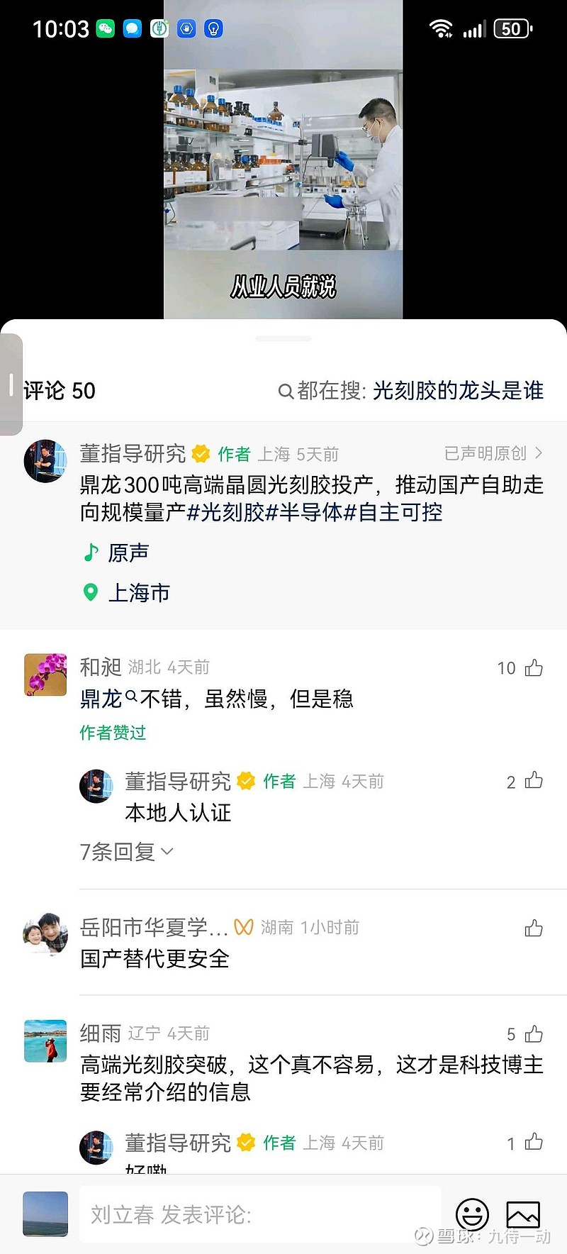 $中芯国际(00981)$ 鼎龙股份建成国内首条覆盖“有机合成-高分子合成-精制纯化-光刻胶混配”全流程的KrF/ArF光刻胶量产线,实现从树脂单体、光致产酸剂等核心原材料到成品光刻胶的100%自主供应quote。这一能力彻底打破日本企业对上游材料的垄断。