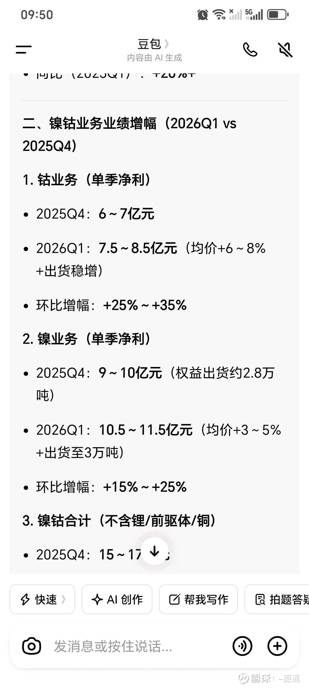 回复@雪月霜: 2026Q1 镍钴价格环比小幅上涨(钴+7%、镍+4%),叠加出货量提升,镍钴业务净利环比+20%~30%,带动公司整体净利环比+20%+,是量价共振的高景气季度。