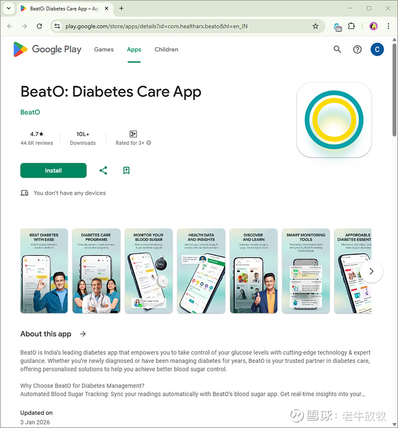 $微泰医疗-B(02235)$ 整合进印度本地糖尿病管理平台BeatO的LINX CGM卖到断货,BeatO app在安卓商店有超过100万下载量,甚至超过雅培libre的全球下载数。虽然不能直接比较但足见潜力巨大。