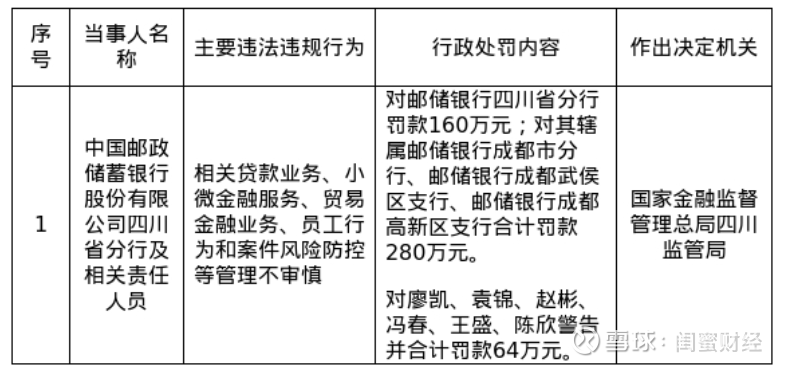 12月17日公开的行政处罚信息显示,金融监管总局四川监管局对邮储银行四川省分行开出了160万元的罚单,同时对其下辖的成都市分行、成都武侯区支行、成都高新区支行合计处以280万元罚款,四家机构累计被罚440万元。