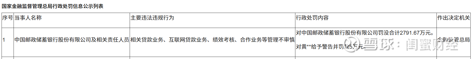 更早之前的9月30日,邮储银行总行曾因贷款业务、互联网贷款、绩效考核等多领域管理不审慎,被国家金融监管总局处以合计约2791.67万元的巨额罚款。
