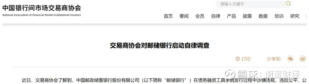 2025年12月15日,中国银行间市场交易商协会在其官网发布公告,称了解到邮储银行在债务融资工具承销发行过程中,涉嫌存在违反公平、公正、勤勉尽责原则的违规行为,因此依据《银行间债券市场自律处分规则》对其启动自律调查。