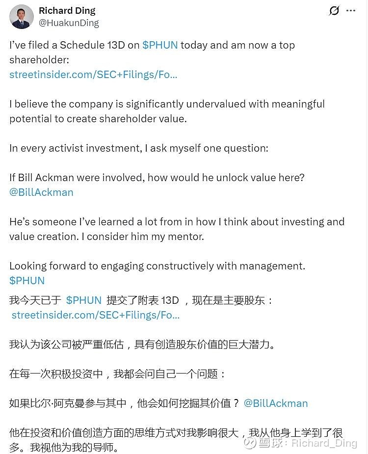 $Phunware(PHUN)$ 今天我们向美国证监会提交了13D表格。我们成为了美国上市公司 PHUN的单一第一大股东。我们认为它极度被低估(市值低于公司现金的50%,公司无负债)。我们将和公司董事会和管理层进行积极的沟通, 寻找大幅提升股东价值的解决办法。 我们可能会寻求董事会席位。我们预计将长期作为它的第一大股东, 协助公司成长, 创造大量的股东价值。$CareCloud(CCLD)$ 网页链接{$Eton Pharmaceuticals(ETON)}
