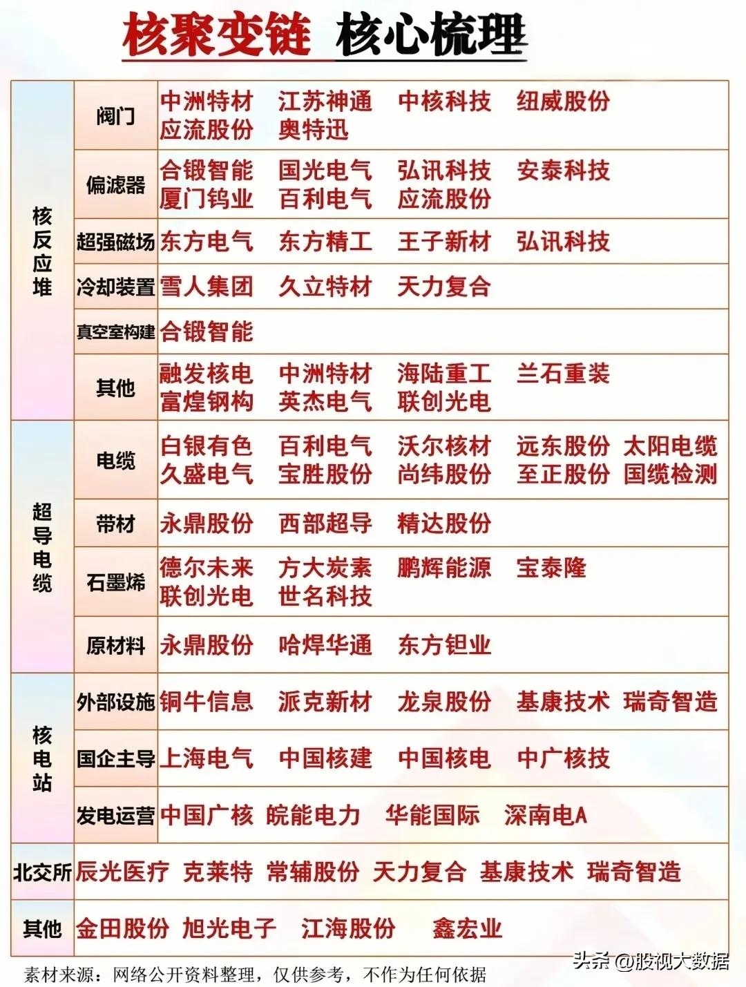 核聚变产业链低位龙头代表:中国核电、皖能电力、百利电气、国机重装等等 。