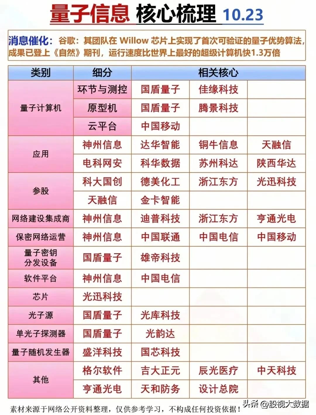 2025年《政府工作报告》提出培育量子科技等未来产业。目标是在2030年前实现量子通信全球领先。量子科技有望成为下一个新主线,周五24日博主有专题文章介绍了量子科技概念。感兴趣的主页查看。相关概念低位龙头代表:达华智能、天和防务、电科网安等等。