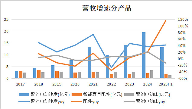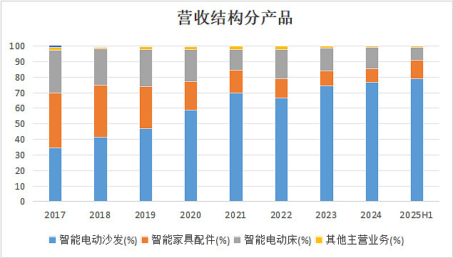 智能电动沙发是公司的核心现金牛产品,销量为核心驱动力、价格稳健提升,实现营收占比逐年提升,2024年营收占比达到76.73%。智能电动床是公司第二大业务,主要针对睡眠健康和老龄化市场,多年来增速较为平缓,2025年H1还出现负增长的势头。智能家具配件是实现智能功能的硬件基础,也是其区别于普通组装厂的核心壁垒,产品包括静音电机、电控系统和精密机械结构件等。这些配件属于“中间品”大部分用于内部生产流程,最终转化为成品出口,小部分对外销售用于维修备件。2022年以来该部分业务营收增速较快的原因是上游原材料(铜、芯片等)暴涨,倒逼公司提高产品单价。
