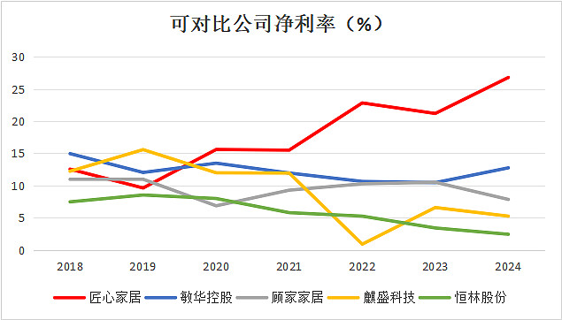 最终,所有关于产品、市场、供应链以及商业模式的优势,都汇聚于其令人艳羡的财务报表上。以大众价位带为主同时覆盖高端市场的敏华控股,和以定价较高以赚取超额品牌溢价的麒盛科技,毛利率较高。匠心家居产品定位中高端市场,毛利率在行业中处于中等水平,但随着高附加值产品占比提升和规模效应下,毛利率提升显著。匠心家居的净利润率常年比同行业公司高出一大截,是其独特的“轻资产+ODM/品牌”商业模式与极致费用管控能力的直接体现。