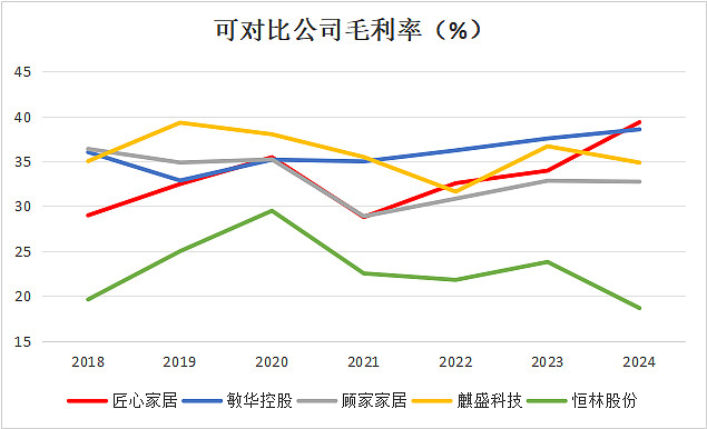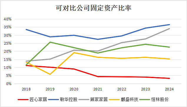 这种轻资产模式下,匠心家居的资产负债表显示出极低的固定资产和在建工程占比,固定资产比率常年在15%以下,且呈现显著下降趋势。以2024年为例,匠心家居的固定资产比率相较于同行的敏华控股、顾家家居低了30多个百分点。这意味着公司无需承担巨额的折旧摊销压力,从而将更多的毛利转化为实实在在的净利润,也能在面对市场波动时具备更强的抗风险能力和更灵活的转身空间。